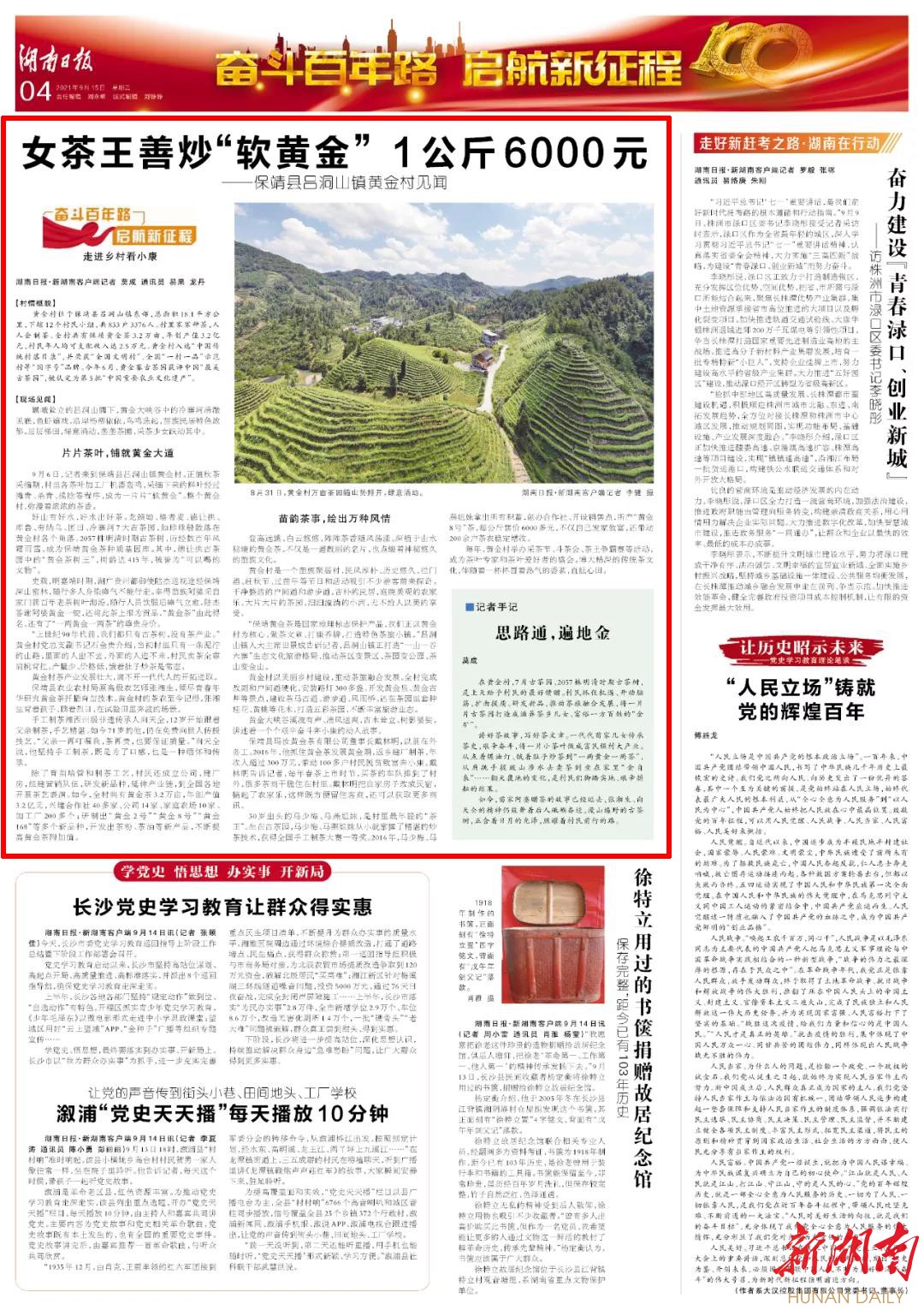 9月6日,记者来到保靖县吕洞山镇黄金村。正值秋茶采摘期,村里各茶叶加工厂机器轰鸣,采摘下来的鲜叶经过摊青、杀青、揉捻等程序,成为一片片“软黄金”。整个黄金村,弥漫着浓浓的茶香。