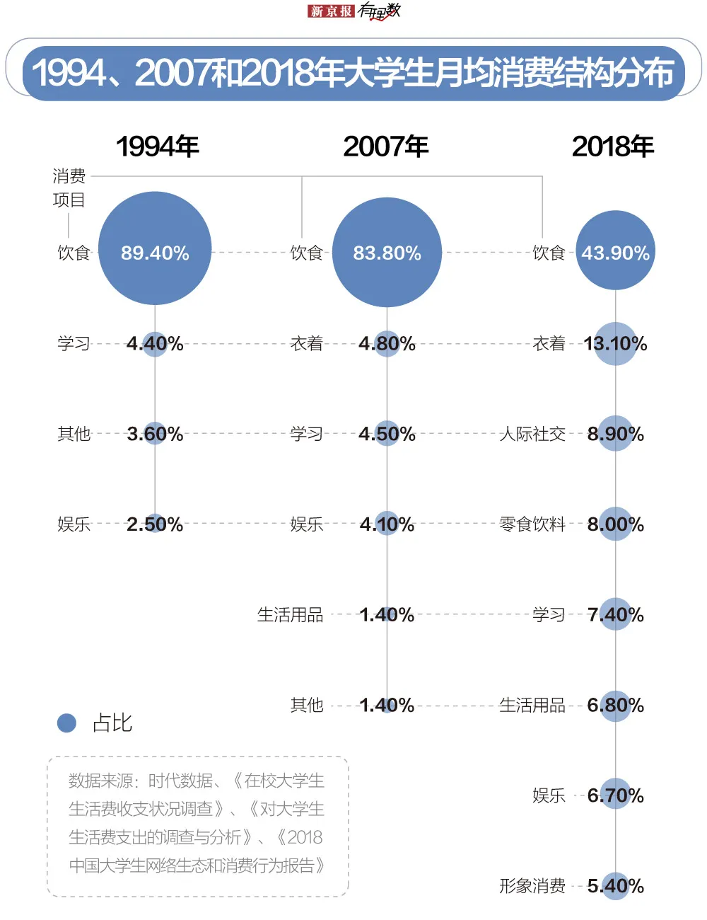 随着社会的发展,到2007年时,大学生的衣着、娱乐开支已经成为一笔不可忽视的开销。而至当下,大学生的消费场景更丰富多元,饮食消费的占比已经下降到半成以下。