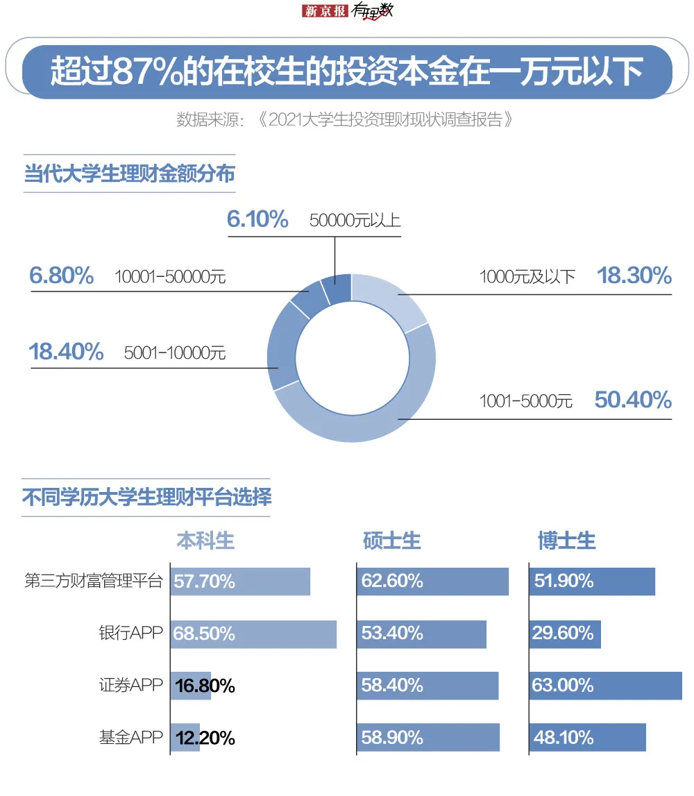 据《2021大学生投资理财现状调查报告》数据显示,超过87%的在校生的投资本金在一万元以下,其中本科生投资本金更多来源于生活费,硕士生、博士生投资本金来源占比最高的是实习兼职所得。