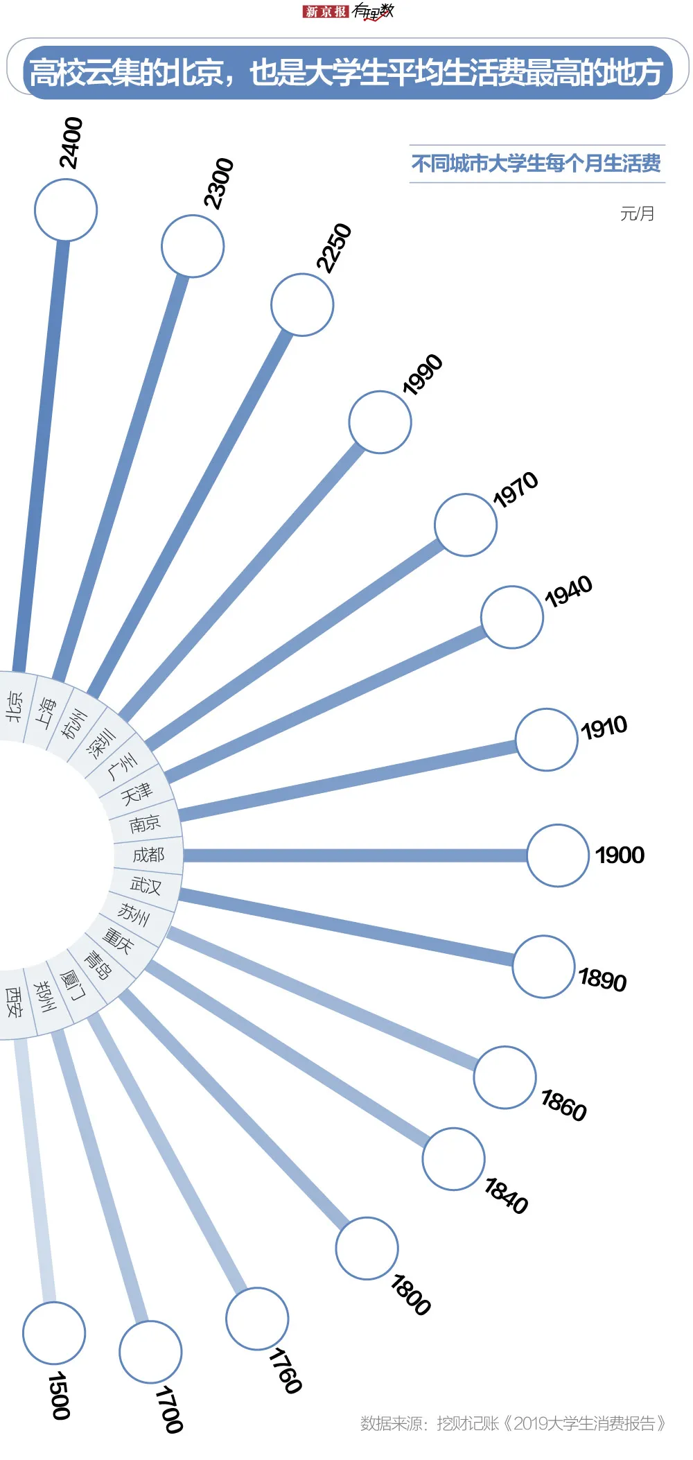 月均生活费超过2000元的城市,有北京、上海和杭州,而深圳、广州这些一线城市的大学生,月均生活费均接近2000元大关。