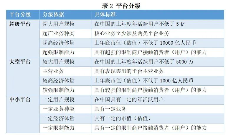 超级平台指同时具备超大用户规模、超广业务种类、超高经济体量和超强限制能力的平台。超大用户规模,即平台上年度在中国的年活跃用户不低于5亿;超广业务种类,即平台核心业务至少涉及两类平台业务,该业务涉及网络销售、生活服务、社交娱乐、信息资讯、金融服务、计算应用等六大方面;超高经济体量,即平台上年底市值(估值)不低于10000亿人民币;超强限制能力,即平台具有超强的限制商户接触消费者(用户)的能力。大型平台上年度在中国的年活跃用户不低于5000万;上年底市值(估值)不低于1000亿人民币。按照这个标准,微信、淘宝、抖音、支付宝等APP将按照超级平台管理。