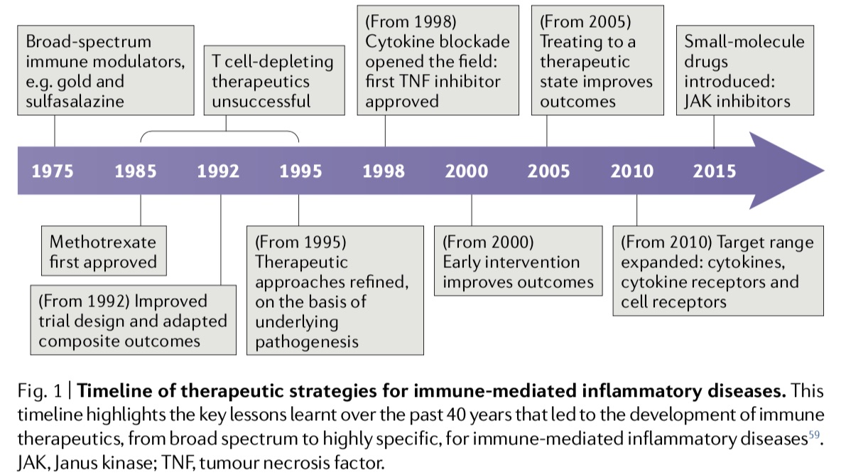 免疫介导的炎症性疾病治疗策略时间表。图来自论文“Immune-mediated inflammatory disease therapeutics: past, present and future”。