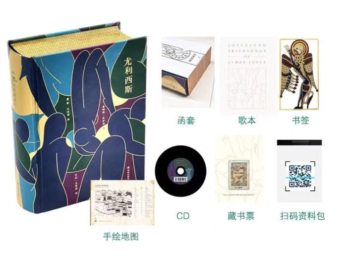 译林版《尤利西斯》珍藏本附送有声课程、全文注释、导读、地图、地标图集等帮助读者理解这本“天书”;套装内还有一张黑胶CD和以爱尔兰《凯尔经》为元素的藏书票、黄铜书签,王珏将其形容为一种“文化集合”,“向读者展示乔伊斯与音乐、与《凯尔经》的关系,从多种路径接近这本书。”