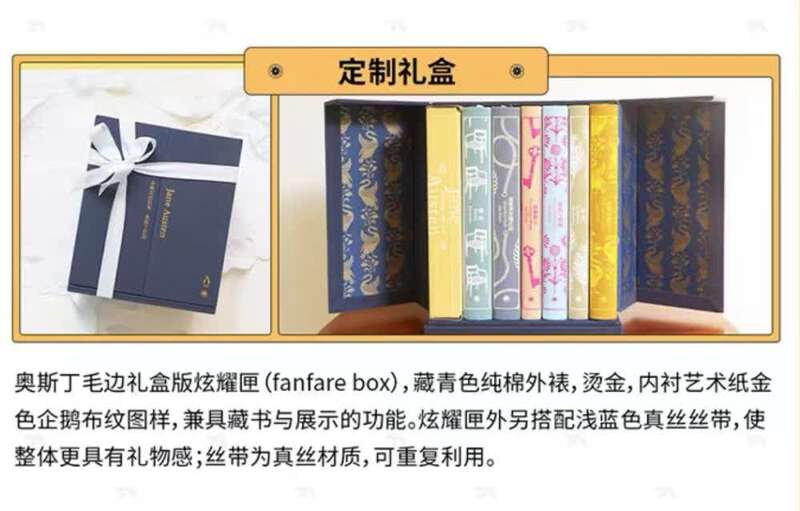 换一种眼光看,纸质书的特装创新也是衍生文创的基础。作家董桥在《苹果花》里写到老友帕克的藏书,“许多心爱的书籍,他重金聘请名匠做书盒书函保护,三册一套五册一套的经典都做了展览匣,美国人干脆叫作炫耀匣,爱看书的好莱坞大明星都买……”译文版奥斯丁作品套装毛边礼盒版就采用了定制的“炫耀盒”,兼具藏书与展示功能,搭配的真丝丝带也能重复利用;礼盒内的文创周边包括复古黄铜夹和兼有尺子、书签、裁书刀功能的黄铜裁书刀,也可单独购买。