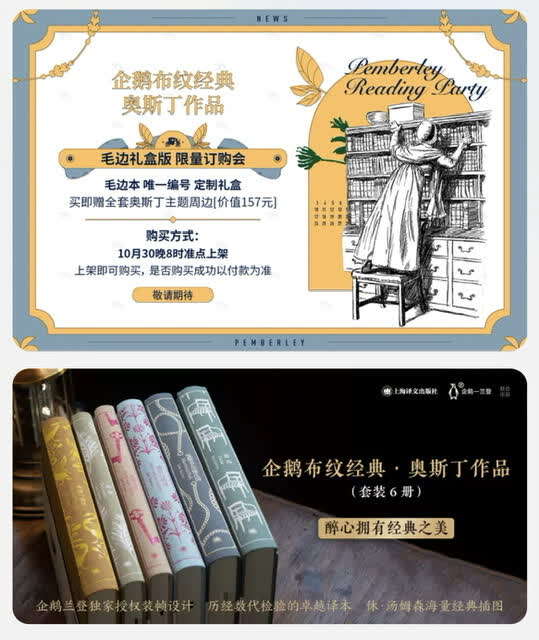 在上海译文出版社天猫旗舰店首页,记者看到,以“彭伯里读书会”为主题的双十一活动页面已经上线。彭伯里,是名著《傲慢与偏见》里达西先生的庄园。与企鹅布纹经典系列合作的作品套装,正是这家出版社自营天猫店的主打商品。预告将于10月30日晚8时上架的毛边礼盒版页面下方有一行小字提示——“上架即可购买,是否购买成功以付款为准”,“秒杀”势头一目可览。