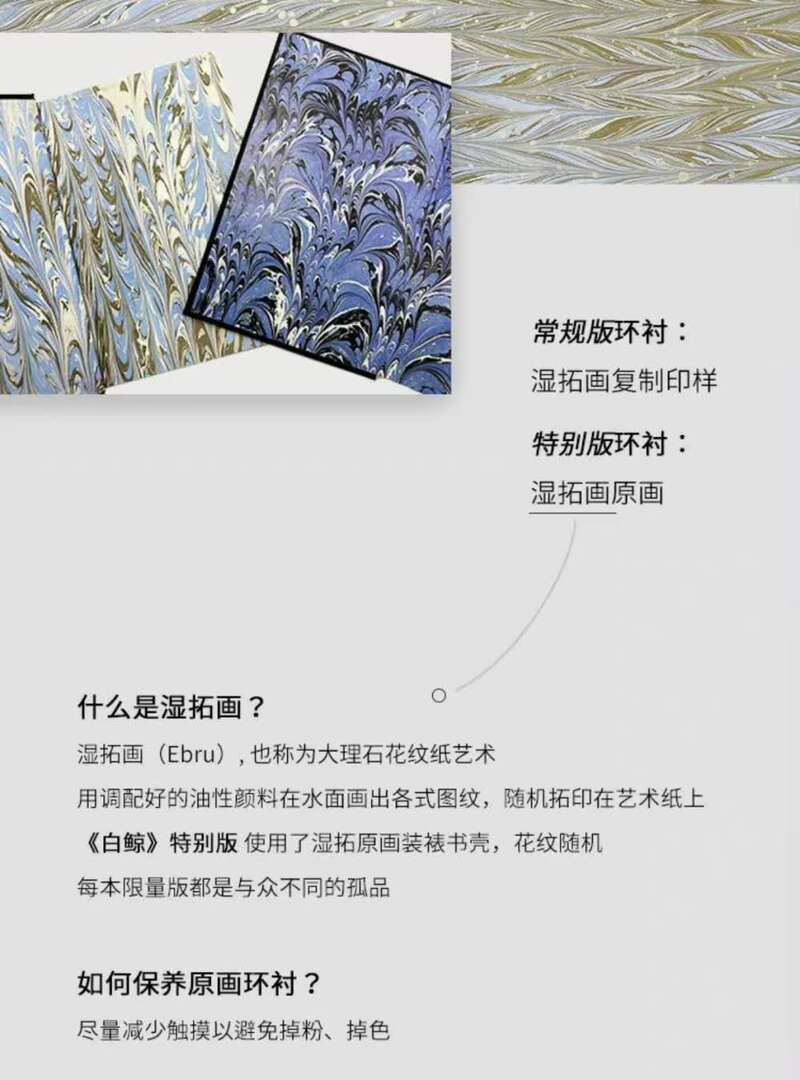 这些“特别版”究竟特别在哪里?其中有读者较为熟悉的毛边本,也有的采取了特殊工艺,比如《白鲸》特别版的环衬采用了湿拓画工艺,《没有个性的人》特别版封面使用31摄氏度感温变色油墨印刷。由于工艺较为复杂,特别版图书大多印量不高。