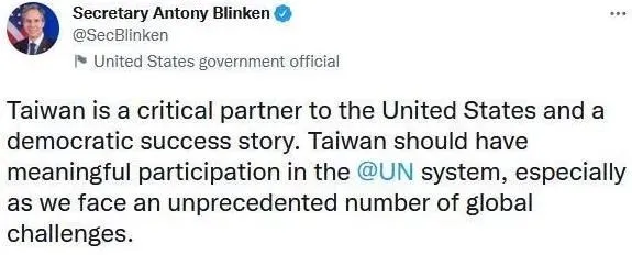 布林肯发推称“支持台湾有意义参与联合国体系”。图源:推特