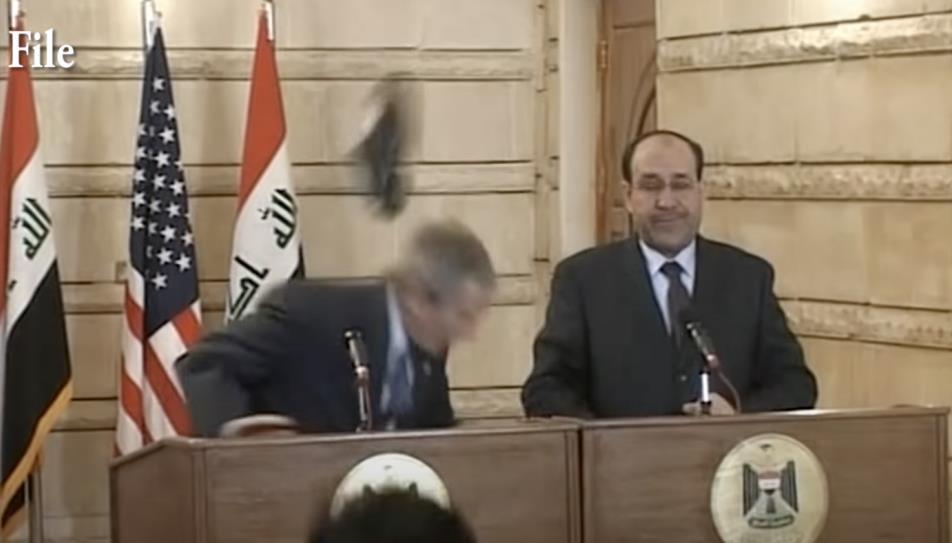 2008年,伊拉克记者扎伊迪向小布什扔鞋,小布什躲闪的瞬间。