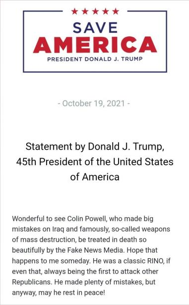 “很高兴看到,曾在伊拉克问题上犯了大错误的科林·鲍威尔,在所谓的大规模杀伤性武器上,被“假新闻媒体们”这样正面地对待。希望有一天我也能享受到这样的待遇。鲍威尔是一个典型的“名义共和党人”(RINO)。”