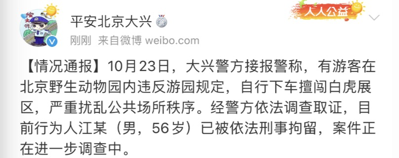 10月23日,大兴警方接报警称,有游客在北京野生动物园内违反游园规定,自行下车擅闯白虎展区,严重扰乱公共场所秩序。经警方依法调查取证,目前行为人江某(男,56岁)已被依法刑事拘留,案件正在进一步调查中。