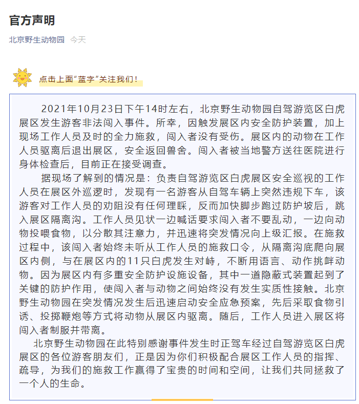 北京野生动物园在此特别感谢事件发生时正驾车经过自驾游览区白虎展区的各位游客朋友们,正是因为你们积极配合展区工作人员的指挥、疏导,为我们的施救工作赢得了宝贵的时间和空间,让我们共同拯救了一个人的生命。