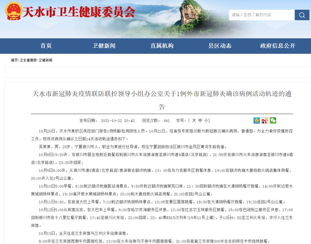 10月20日,甘肃省天水市麦积区疾控部门报告1例核酸检测阳性人员。吴某某,男,29岁,宁夏银川市人,职业为某旅行社导游,现住宁夏回族自治区银川市金凤区黄河东路街道。
