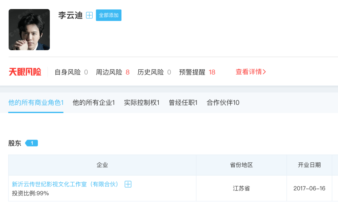 天眼查显示,目前李云迪名下仅新沂云传世纪影视文化工作室一家公司,李云迪出资99%,为最终受益人。