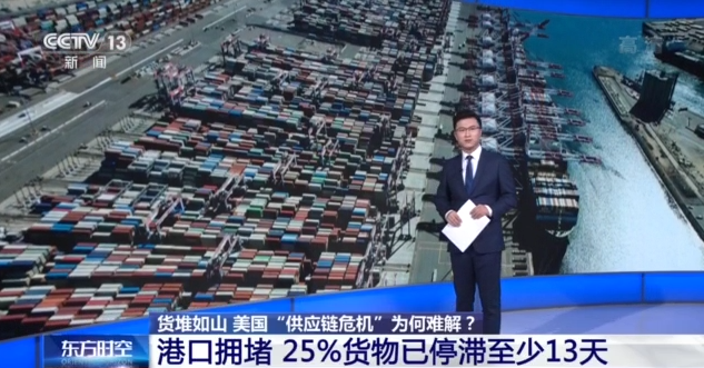 央视记者 许弢:这是全美最繁忙的货运港口的洛杉矶港。据港口方面公布的信息显示,在当地时间10月20日,这里的在港货船有24艘,排队等待进港的货船有11艘。但从船上卸载下来的集装箱已经堆满了码头。