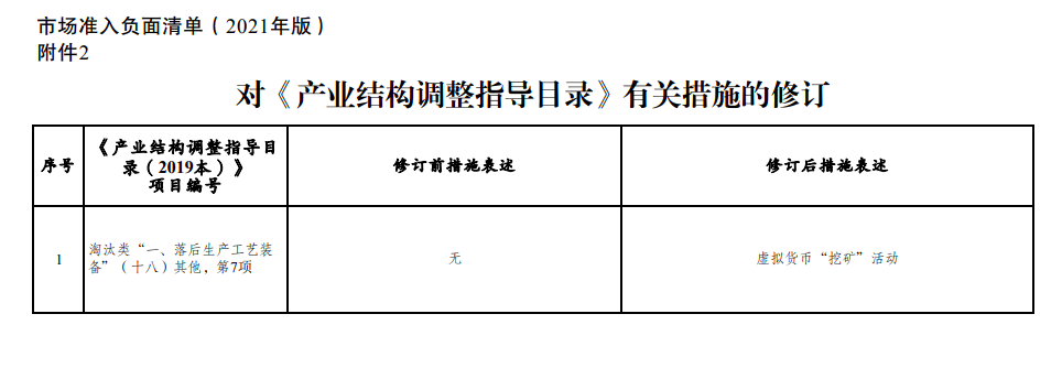 10月8日,国家发展改革委就《市场准入负面清单(2021年版)》向社会公开征求意见,其中提到对《产业结构调整指导目录》有关措施的修订,拟将虚拟货币“挖矿”活动纳入淘汰类产业。