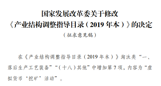 10月21日,国家发展改革委网站发布关于修改《产业结构调整指导目录(2019年本)》公开征求意见的通知,拟在《产业结构调整指导目录(2019 年本)》淘汰类“一、 落后生产工艺装备”“(十八)其他”中增加第7项,内容为“虚拟货币‘挖矿’活动”。