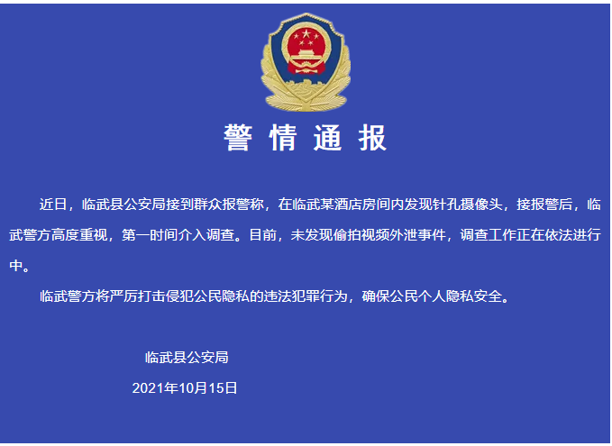 据“临武县公安局”10月15日通报,近日,湖南省郴州市临武县公安局接到群众报警称,在临武某酒店房间内发现针孔摄像头,接报警后,临武警方高度重视,第一时间介入调查。目前,未发现偷拍视频外泄事件,调查工作正在依法进行中。临武警方将严厉打击侵犯公民隐私的违法犯罪行为,确保公民个人隐私安全。