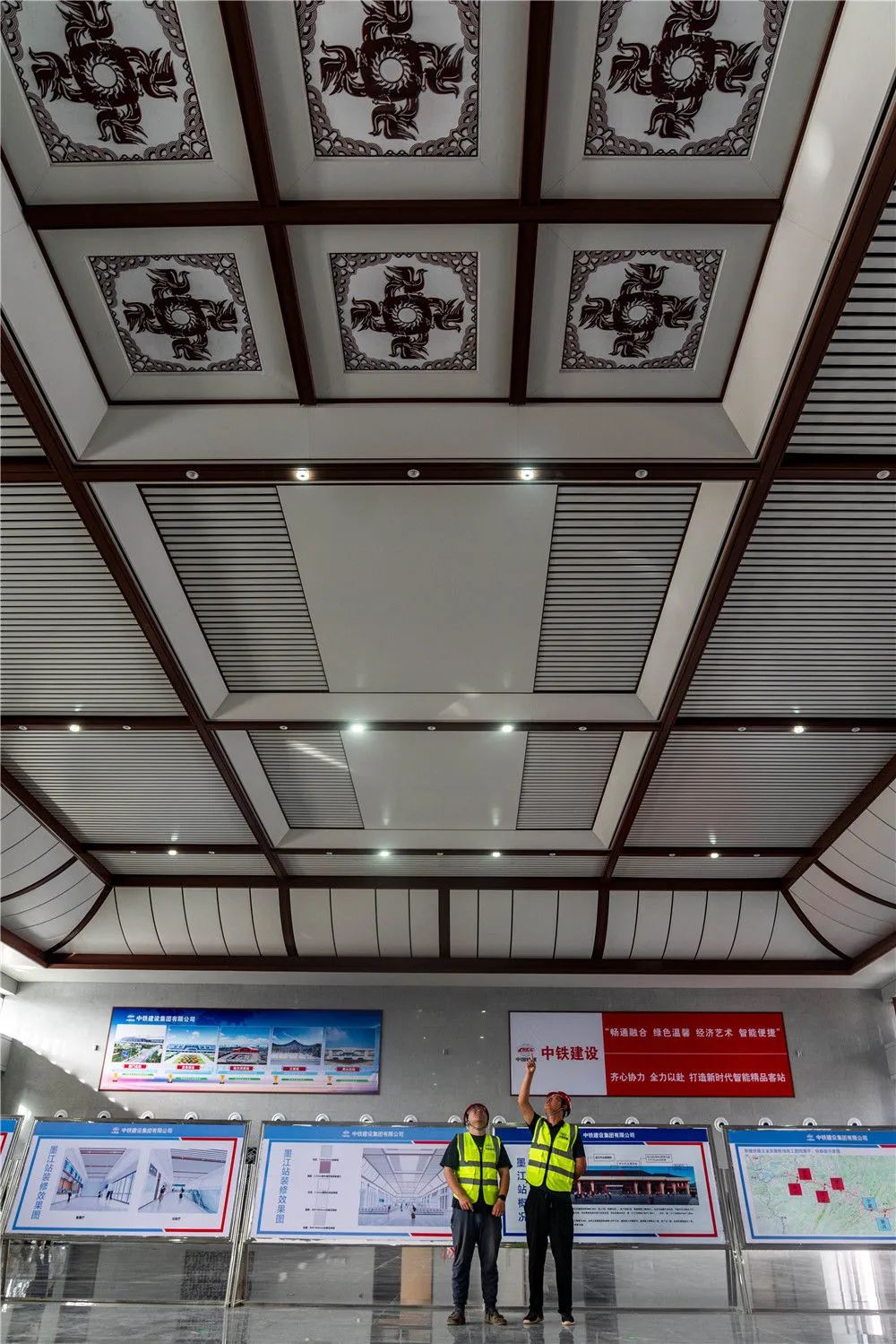 9月28日拍摄的中老铁路墨江站候车大厅。吊顶中间区域装饰有哈尼族群众喜爱的白鹇鸟环抱太阳的图案。新华社记者 胡超 摄