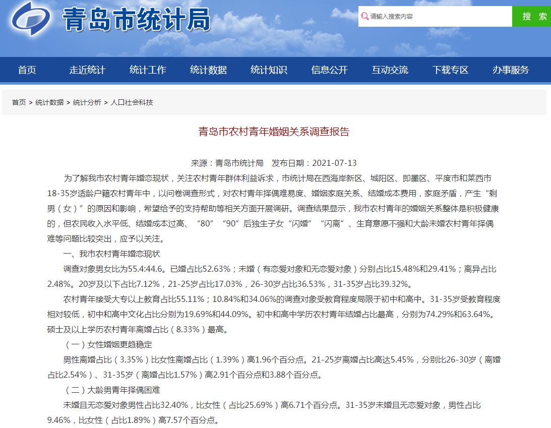 农村青年婚姻情况受到了多方关注。据媒体报道,今年多地统计部门发文称,根据《国家统计局办公室关于做好2021年重点选题调研工作的通知》以及《国家统计局关于开展农村青年婚姻关系调研的通知》,选择部分地区进行农村青年婚姻关系情况调研。