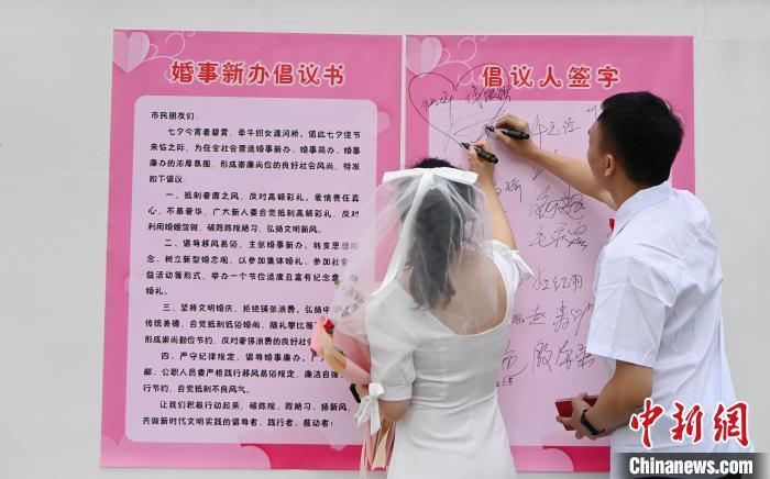 资料图:新人在倡议书上签名。 安源 摄 (图文无关)
