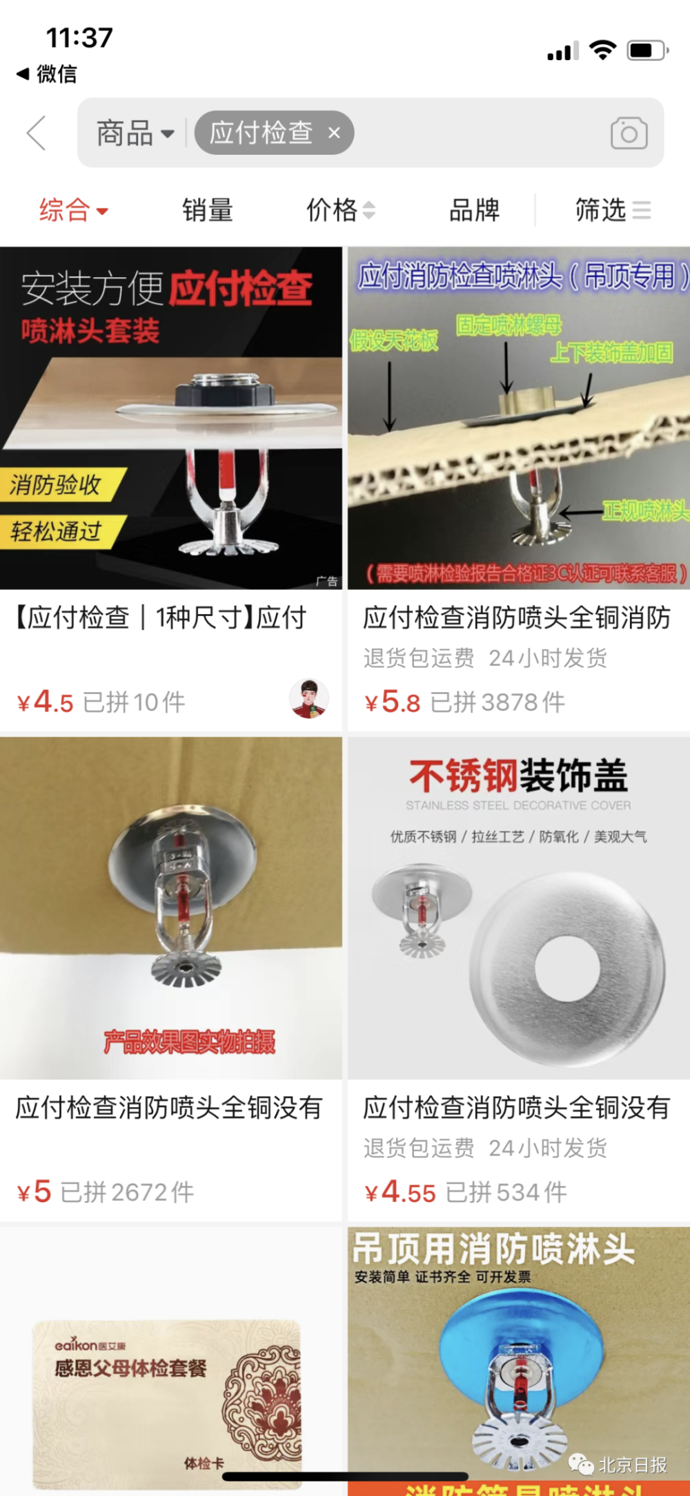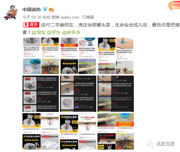 今天上午,淘宝、京东和拼多多平台上多家店铺因售卖名为“应付检查假消防喷淋头”的物品,被中国消防点名批评:“应付二字赫然在,违法当做噱头卖,生命安全成儿戏,最后你是把谁害?”