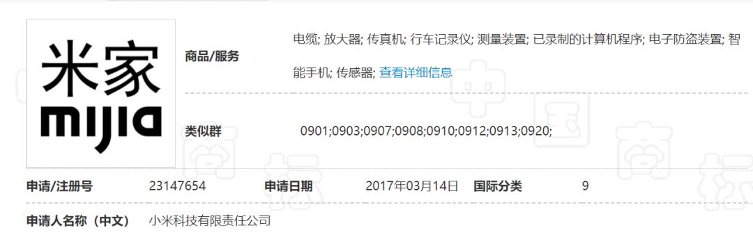 2016年3月,小米集团(1810.HK)发布了智能家电品牌米家(mijia),2017年3月,“米家 mijia”商标申请注册。