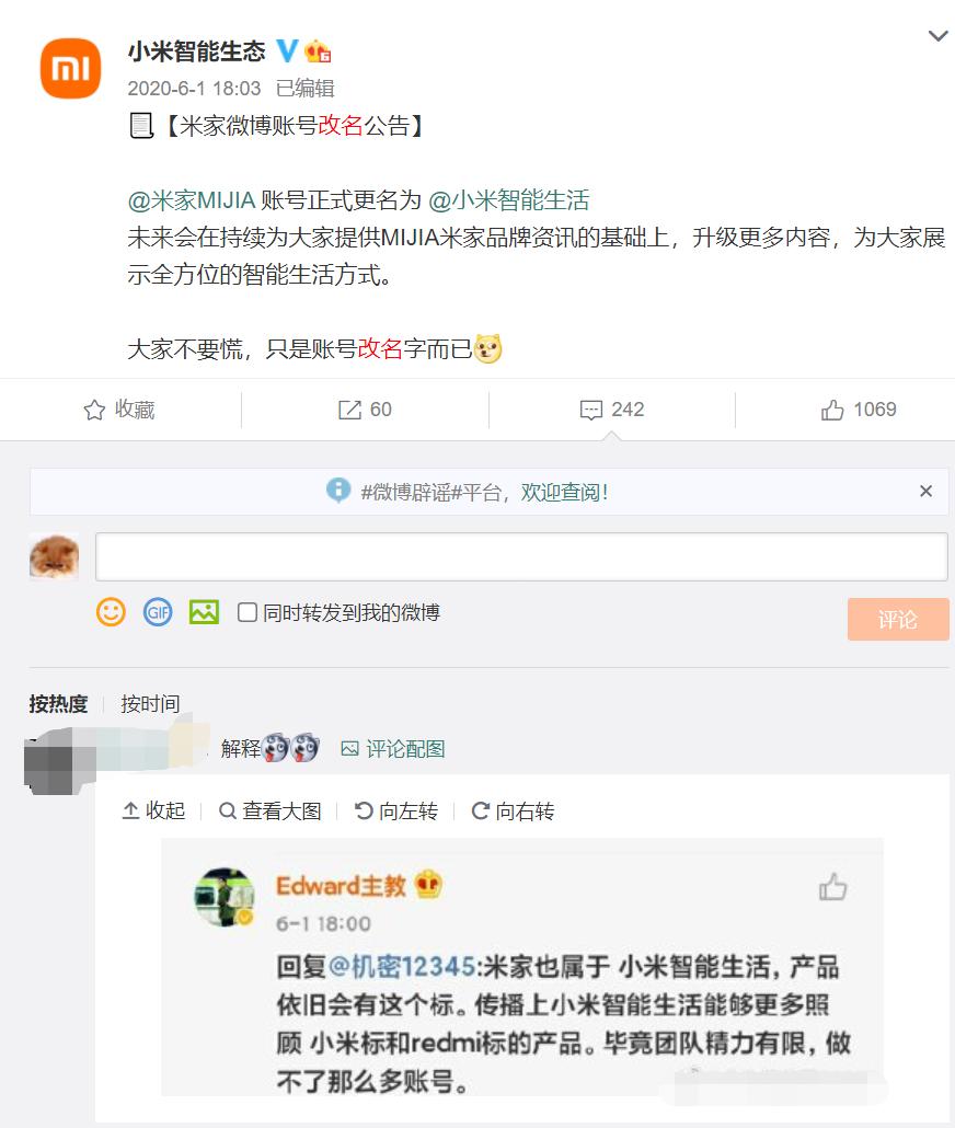 有趣的是,终审判决公布前,2020年6月米家微博账号更名为“小米智能生活”,目前又更名为“小米智能生态”。