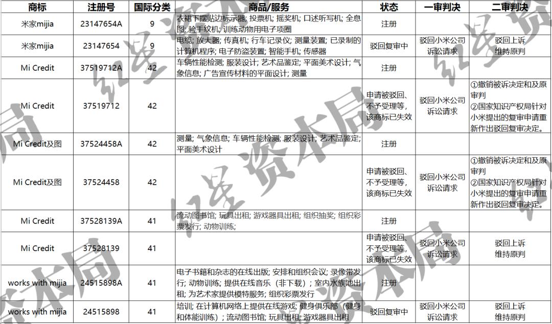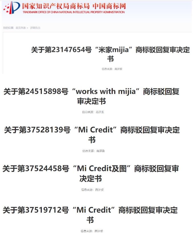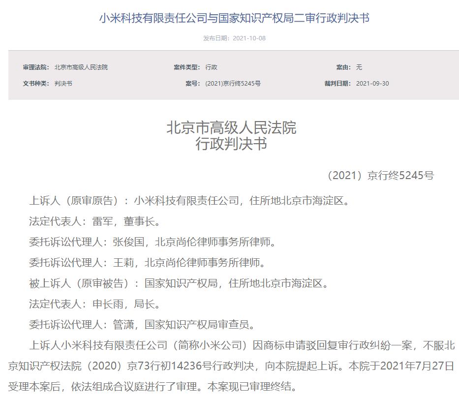 10月8日,红星资本局注意到,北京法院审判信息网集中公布的小米科技与国家知识产权局二审行政判决书,起源均为2020年下半年,国家知识产权局对小米旗下商标的驳回复审决定书。