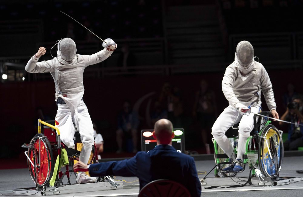 轮椅击剑运动员李豪(左)获得中国体育代表团在东京残奥会的首枚金牌
