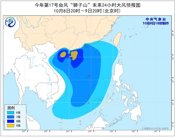 “狮子山”登陆后将转向西北方向移动,穿过海南岛后,进入北部湾,尔后趋向越南北部。预计,10月8日20时至9日20时,广东大部、广西中东部、海南岛大部等地有大到暴雨,其中,广东南部、广西东南部、海南岛西北部等地的部分地区有大暴雨(100-190毫米)。