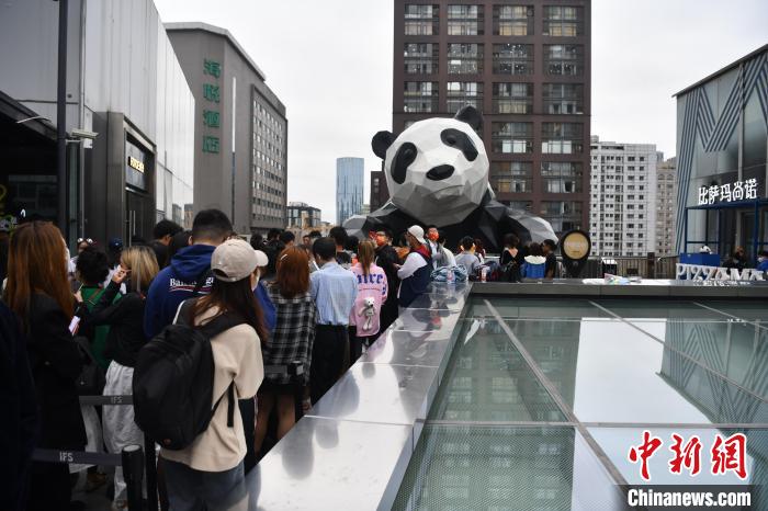 10月5日,正值国庆长假期间,位于成都市春熙路附近的“I am here”网红大熊猫雕塑人气旺,吸引各地游客前来打卡,现场排起长队。