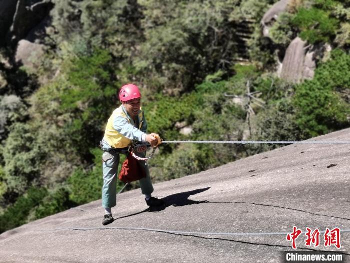 李培生在崖壁上放绳作业。葛旭芳 摄