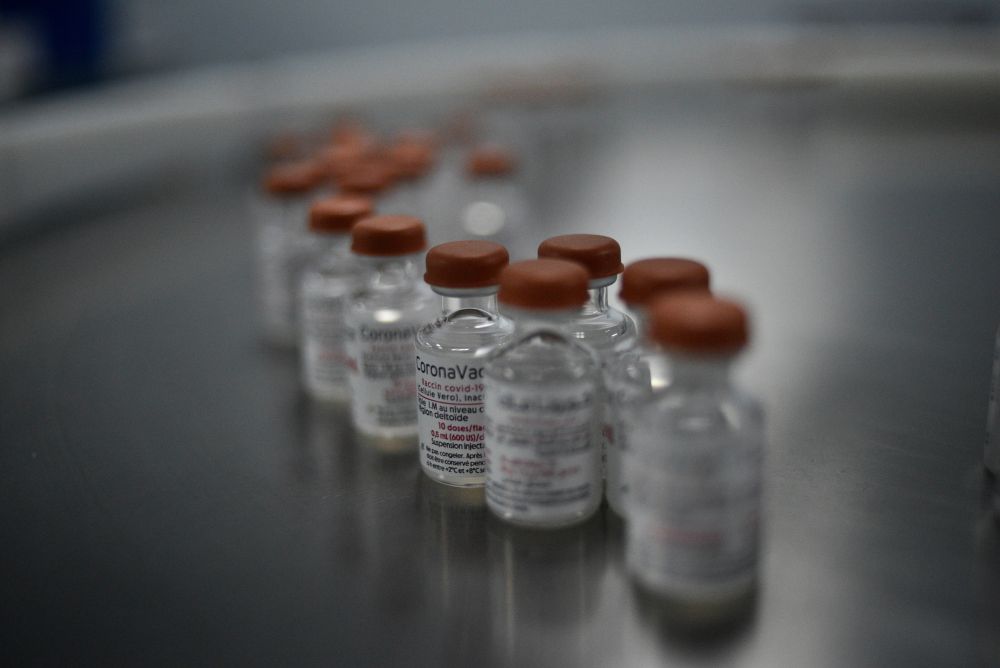 这是9月29日在阿尔及利亚东部城市君士坦丁拍摄的中国科兴公司和阿尔及利亚赛达尔医药集团合作生产的新冠疫苗。(新华社发)