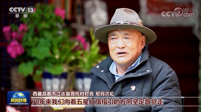 西藏昌都市江达县岗托村村民 尼玛次仁:70年来我们向着五星红旗指引的方向坚定跟党走,党带领我们翻身得解放,现在又脱贫奔小康,我们真是生活在了最好的时代,五星红旗在我们心中扎了根。