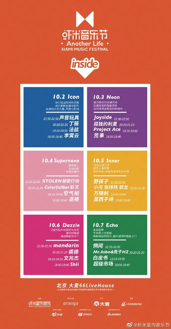 值得一提的是,此前停止服务的虾米也于近日“复活”,10月2日-7日,虾米室内音乐节将迎来Joyside、野孩子、小河、莫西子诗、白皮书、超级市场等24组音乐人表演。