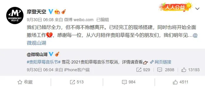 还有个别音乐节在开演前临时取消。9月30日,原计划于10月1-2日举办的贵阳草莓音乐节突然宣布取消,同样是出于疫情防控要求的考虑。