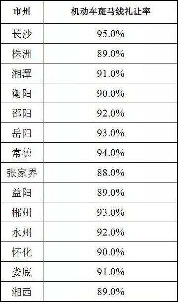 全省各地机动车斑马线礼让率平均值为91.1%,其中长沙、常德、岳阳、郴州的礼让率较高,分别为95.0%、94.0%、93.0%、93.0%。
