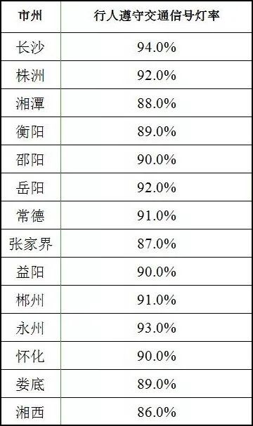 全省各地行人遵守交通信号灯率平均值为90.1%,其中长沙、永州、株洲、岳阳的遵守率较高,分别为94.0%、93.0%、92.0%、92.0%。