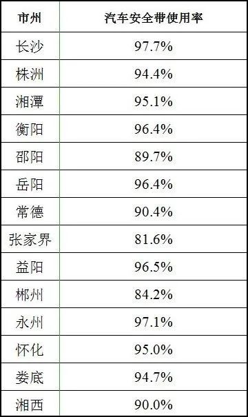 全省各地汽车安全带驾驶人使用率平均值为92.8%,其中长沙、永州、益阳的使用率较高,分别为97.7%、97.1%、96.5%。