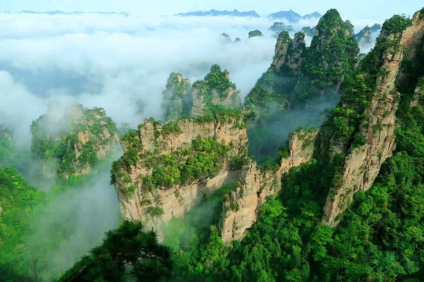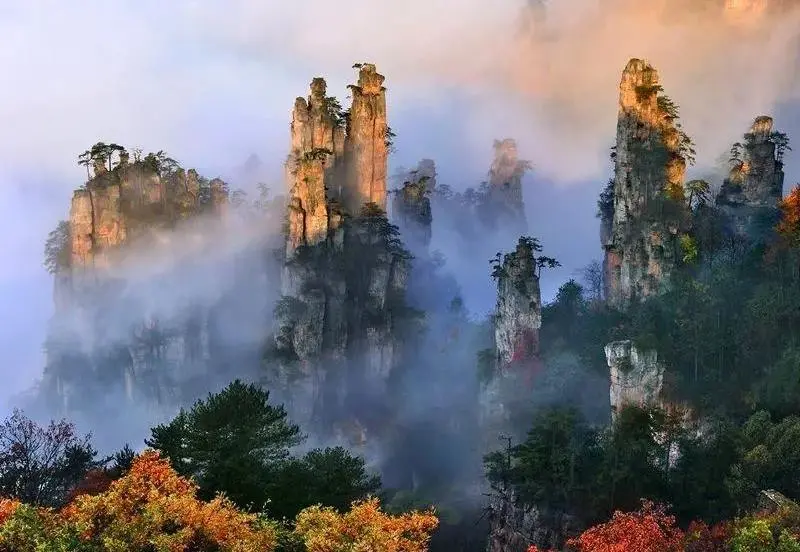 它是由张家界国家森林公园、索溪峪、天子山景区等组成,张家界国家森林公园景区内自然风光以峰称奇、以谷显幽、以林见秀,其间有奇峰3000多座,如人如兽、如器如物,形象逼真,气势壮观,峰间峡谷,溪流潺潺,浓荫蔽日,有“三千奇峰,八百秀水”之美称。主要景点有黄石寨、金鞭溪、袁家界、杨家界等。