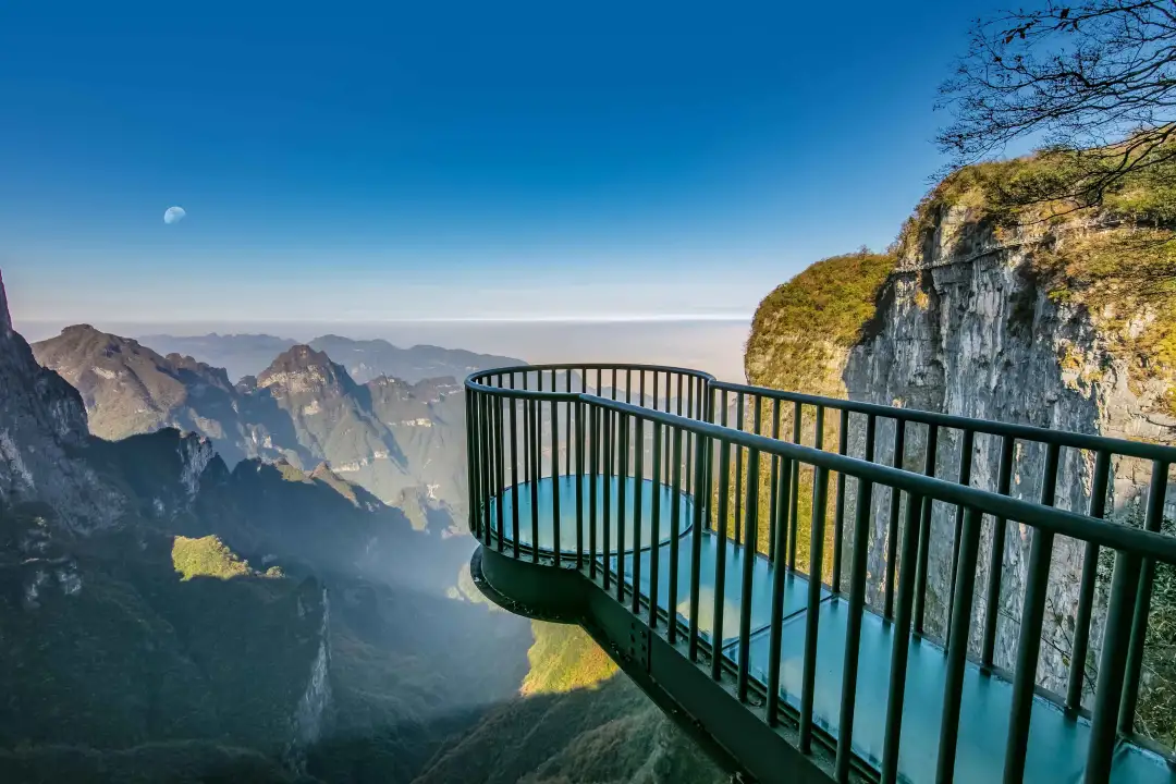 还有一条横跨东西两峰之间的玻璃桥,光洁通透,穿云钻雾,分外壮丽雄浑。它是世界最高、跨度最长的玻璃桥,桥拱距谷底相对高度约300米,全长约430米,桥面全部采用透明玻璃铺设,桥中心有全球商业蹦极中最高的蹦极。