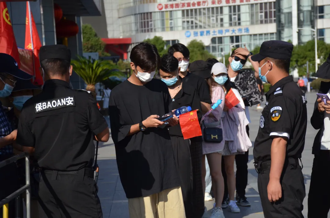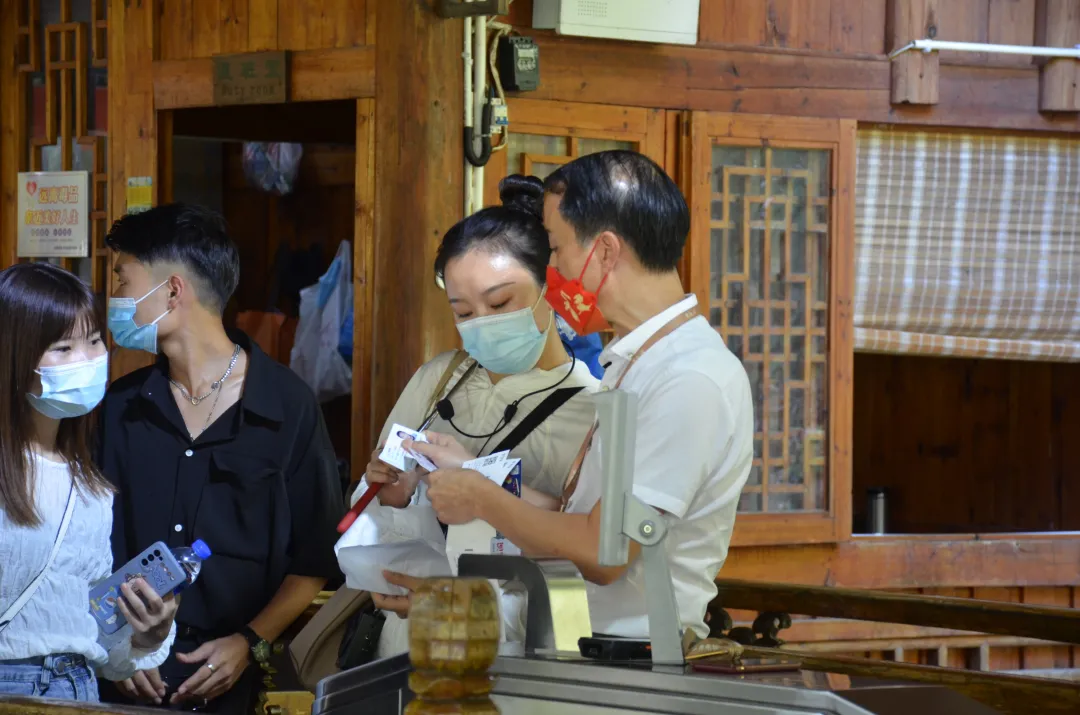 扫码、测体温、查验健康码和通行码……10月2日下午,这支由广州某企业32人组成的游客团在光明国旅导游黄娇的带领下来到了黄龙洞景区游玩。数十名游客在检票口依次保持一米的距离站在安全圈内,逐一完成各项检测后有序进入景区。