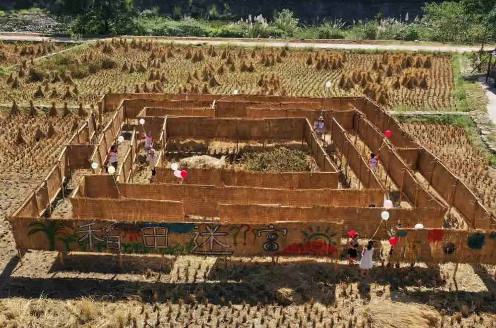 10月1日,游人在张家界武陵源黄龙洞景区稻田迷宫中游玩(无人机照片)。吴勇兵 摄