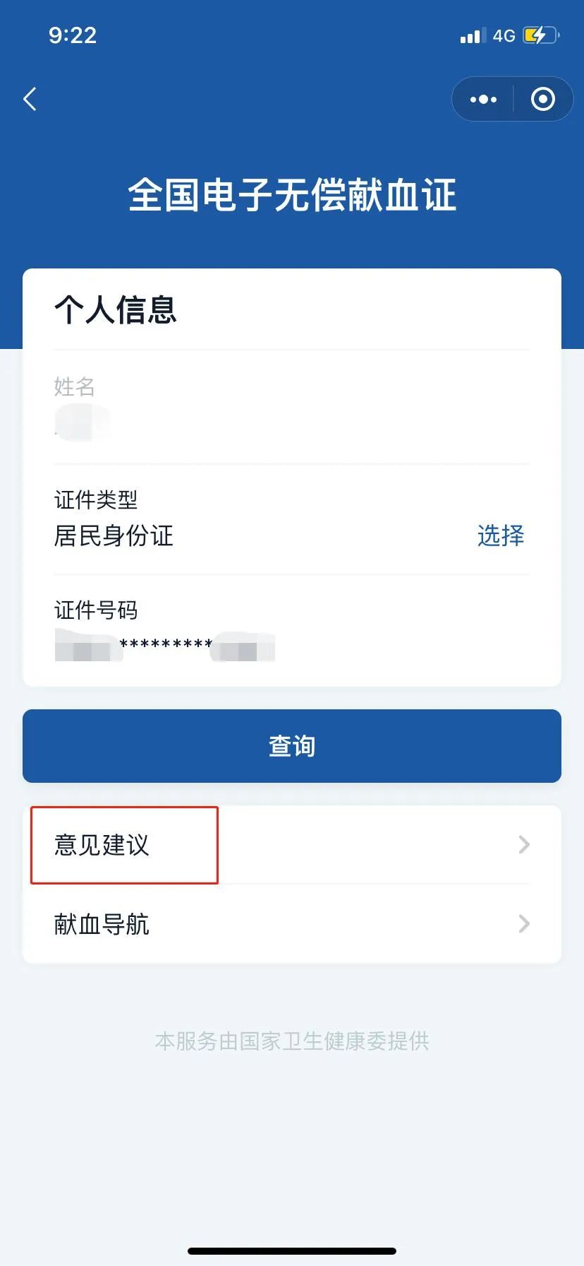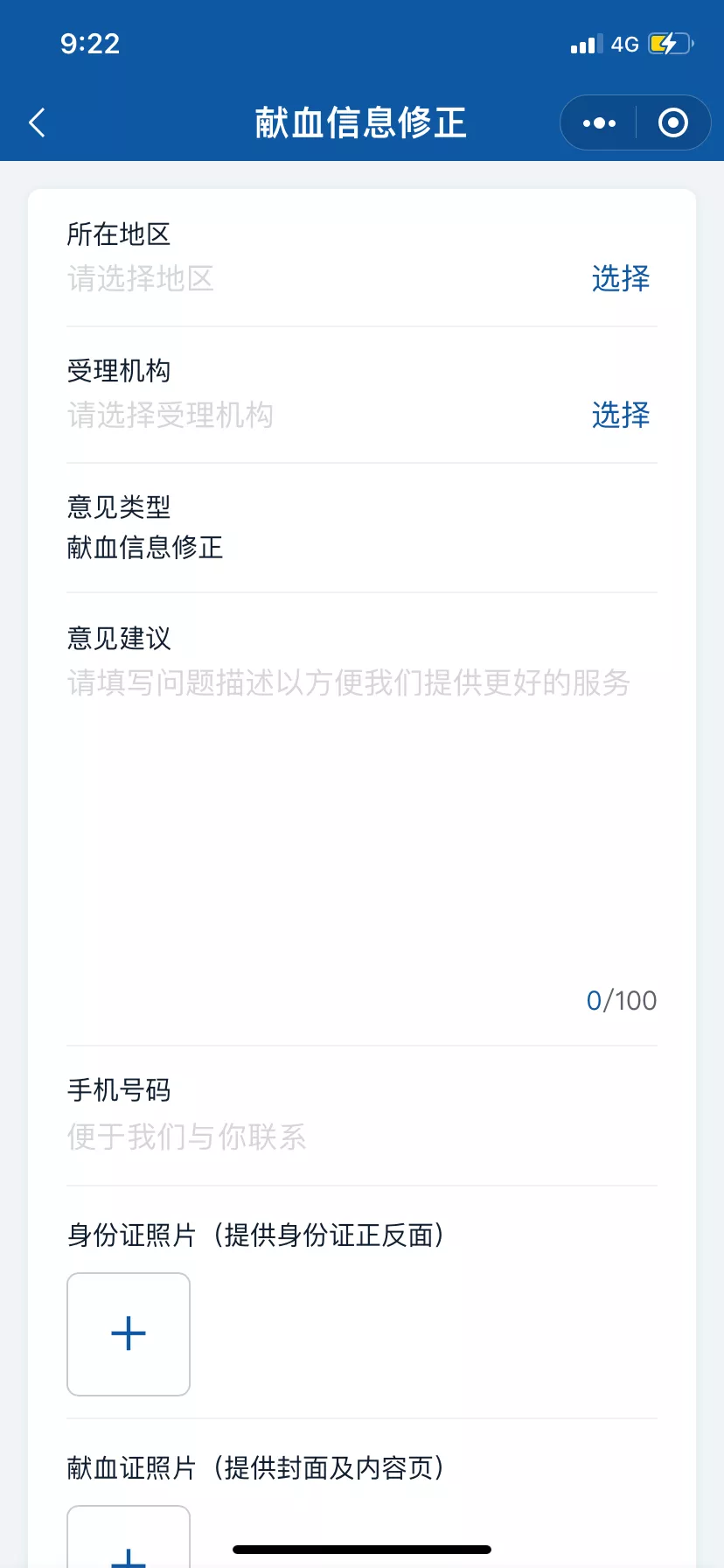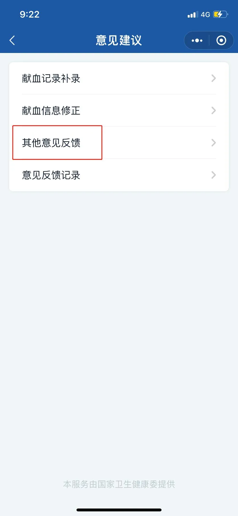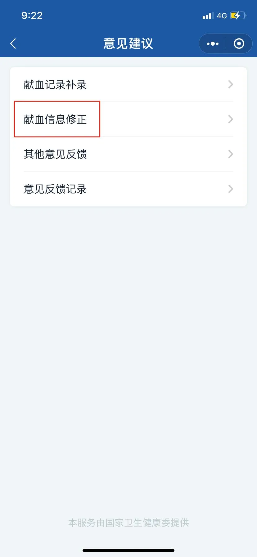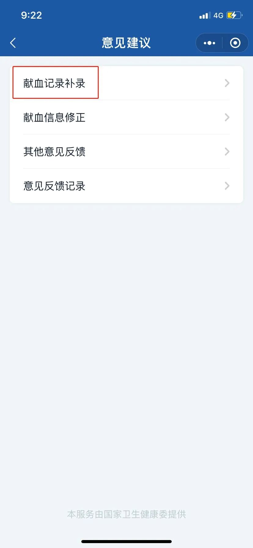 在“意见建议”中点击【献血记录补录】,输入“所在地区”“受理机构”“手机号码”“身份证照片”“献血证照片”等信息,提交审核通过后即可补录献血记录。