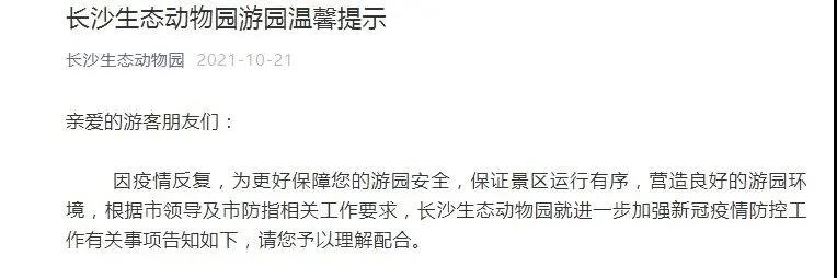 因疫情反复,根据市领导及市防指相关工作要求,长沙生态动物园就进一步加强新冠疫情防控工作有关事项告知如下。
