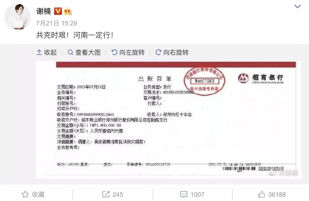 今年7月,吴京谢楠夫妇还向河南灾区捐款100万元。