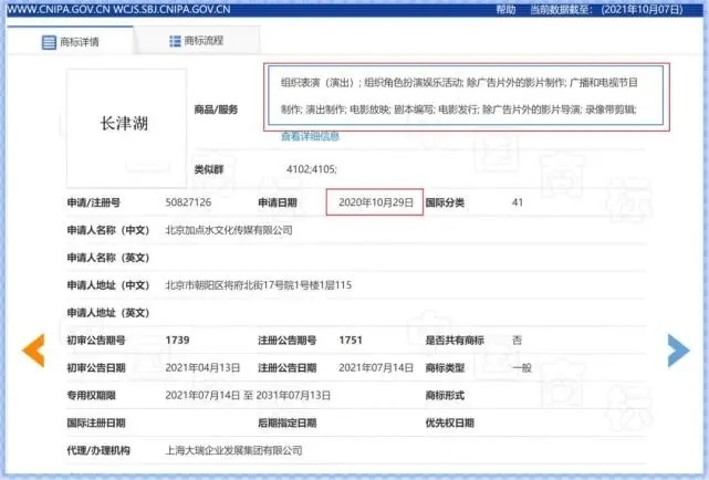 某导演说拥有第41类“长津湖”商标所有权,记者查询后发现,这件商标应该是第50827126号商标,申请时间是2020年10月29日。有网友认为,说《长津湖》电影侵犯商标权是“碰瓷”,“明显是知道人家拍了才去抢注的。”