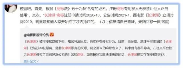 一位资深律师在朋友圈发文表示:“蹭热度也应有底线,拿长津湖商标蹭长津湖伟大战役的热度非常难以接受。商标权利也有适用范围,漫无边际地夸张性放大、扭曲性解读商标将给公众带来不必要困扰和误导,令人担忧。”