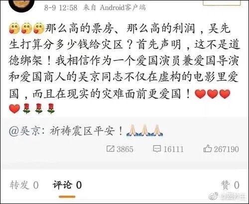 2017年8月,吴京主演的《战狼2》大火。当月8日,四川阿坝州九寨沟县发生7.0级地震,有人以票房大卖为由,要求吴京捐款。