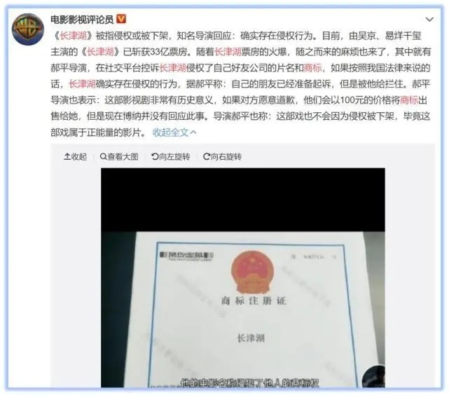 例如,某媒体以《票房破34亿,长津湖被控告侵权,有下架风险?》为题作出报道,并指出电影没有下架是“因为他们(商标权所有人)并不缺钱”。
